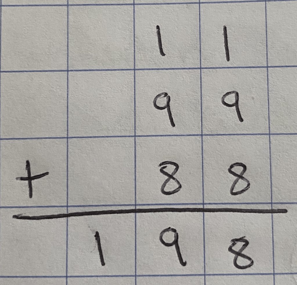 I then adopted a similar approach with the tens column (x + y = 10 so don’t forget to “carry” the 10 into the tens column which I initially did!). Looking at the digits we can see that 10x + 10z + 10 = 100x which we can simplify to get z + 1 = 9x. Now since x, y and z are all single digit numbers I could then use the two constraints to deduce their values:
