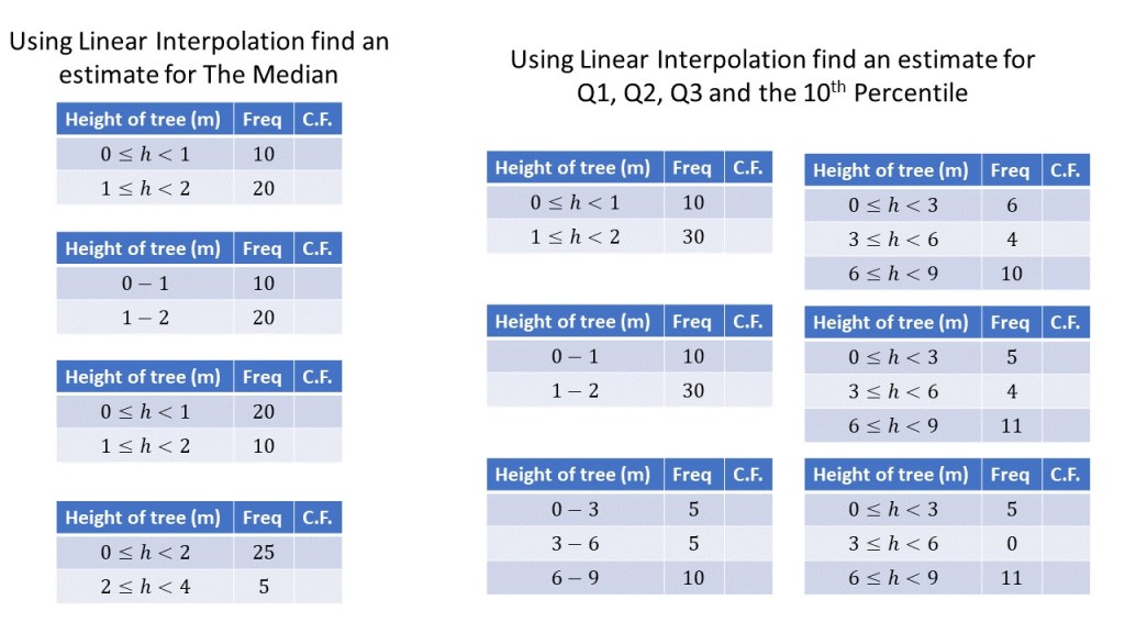 A few questions getting students to find Q1 Q2 Q3 from a grouped frequency table using Linear Interpolation