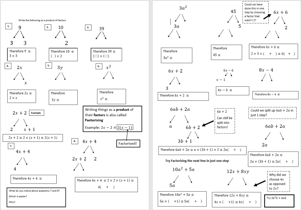 This Question on the left gets the students to ask if there is a more efficient way of answer the same question leading to a factor of 6 on the outside of the bracket later on. As a class we discussed the differences between prime factorisation and splitting things into their factors and also using brackets when writing something in its factorised form. This question on the left encapsulates lots of these thoughts at once.